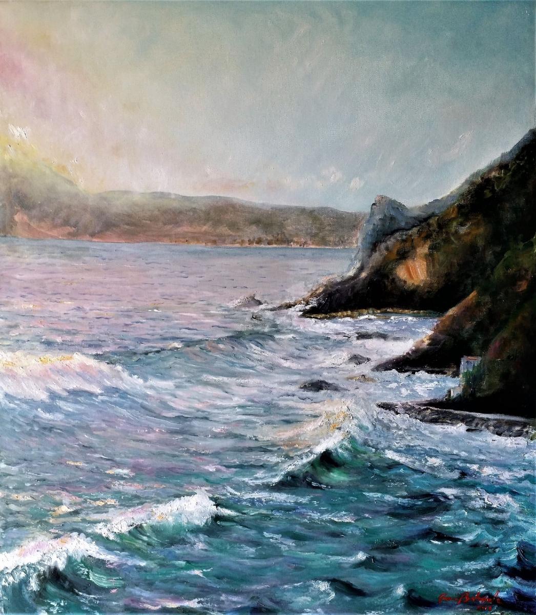 Tra i temi più cari all’artista le Mareggiate, definite con pennellate veloci, ricche di varie e profonde gradazioni di blu, azzurro e verde, percorrono la tela fermando onde increspate e turbinose che s’infrangono sulla spiaggia. Egli conosce e reinterpreta la lezione di Claude Monet e i suoi mari tempestosi visti in Normandia, così come i flutti travolgenti e vivi dipinti da Paul Gauguin o il Mediterraneo materico e luminoso ammirato dalla costa di Saintes Maries de la Mer da Van Gogh.